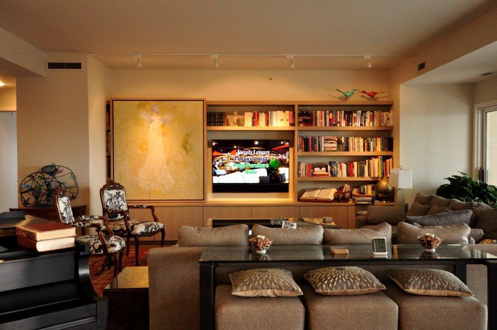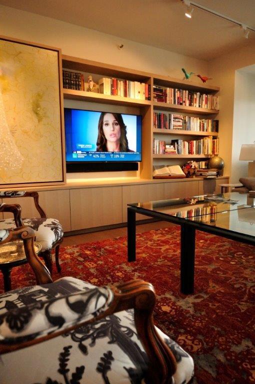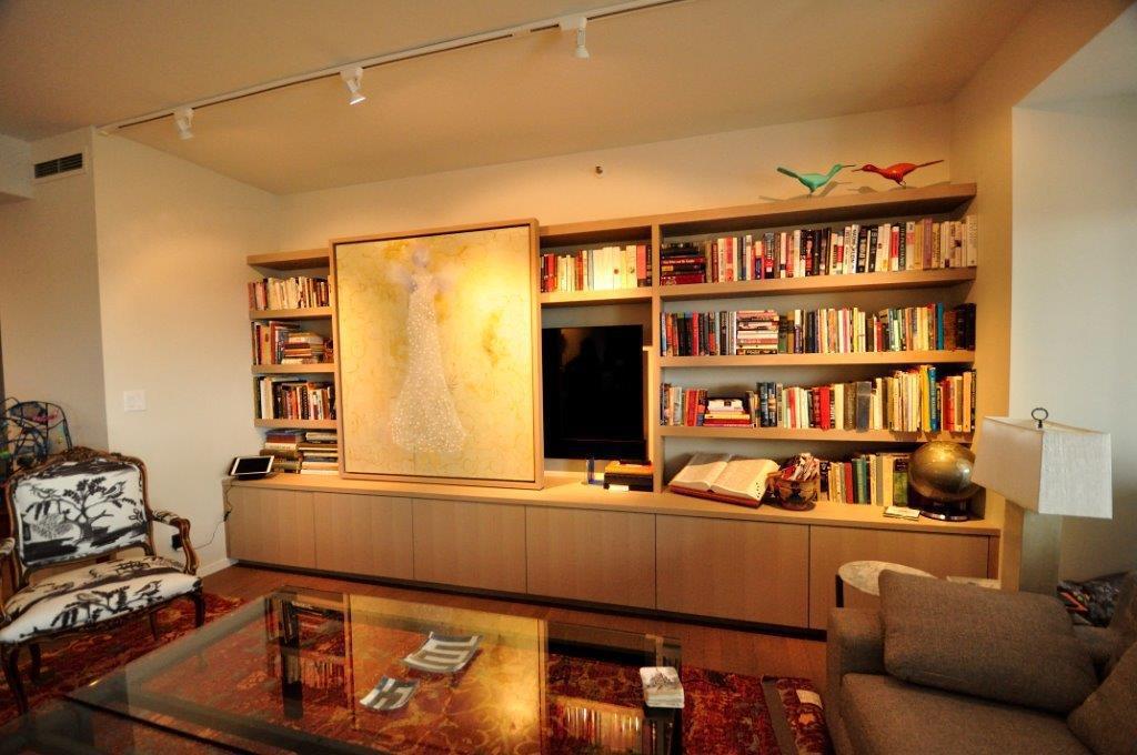 During an extensive remodel, we worked closely with the project contractor and a custom cabinet company to install a home entertainment system that tucks away completely when not in use. When guests enter our client’s home, they are welcomed by a wall of cabinetry that features a large statement painting. The artwork sits on a hidden track that allows it to slide seamlessly in front of the bookshelves, revealing a 55” television at our client’s command.