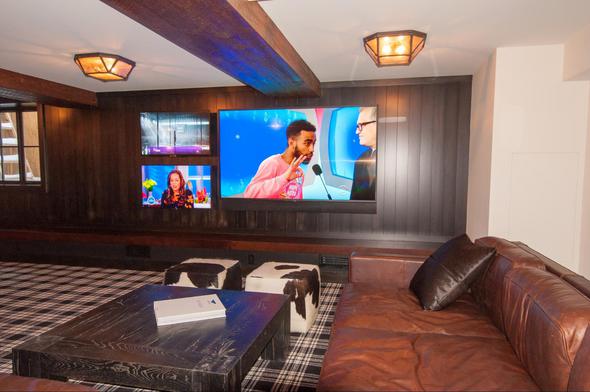 The remodel features a massive TV wall comprised of one 85” TV squared by two 43” TVs to the left. Each TV, including a fourth screen in the basement bar, has access to three DirecTV receivers, AppleTV, and a BluRay player. A flexible operating system permits the user to play content from multiple sources and switch between the audio from screen to screen.